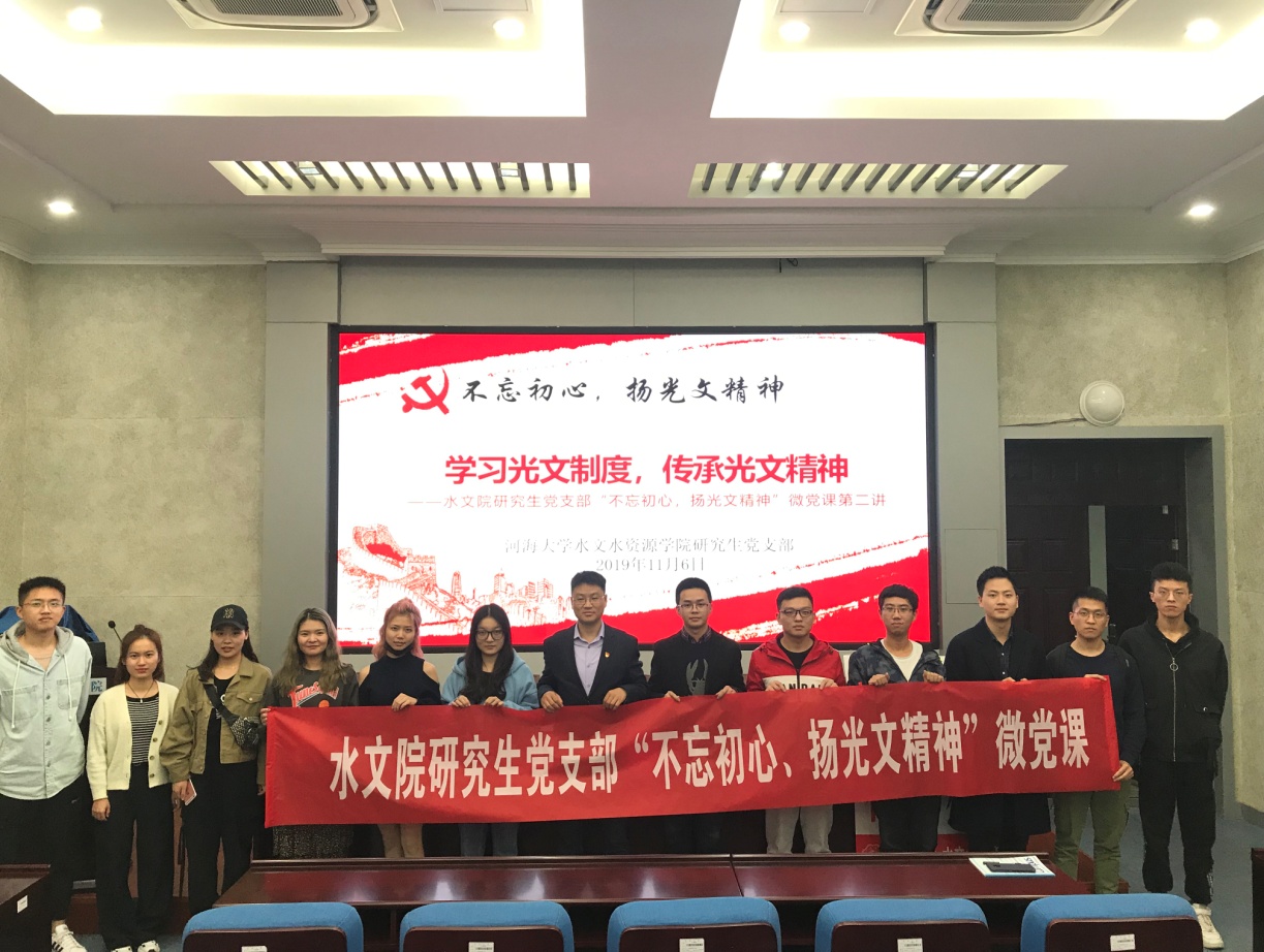 此次活动为成人视频 研究生党支部“不忘初心,扬光文精神”微党课系列活动第二讲,活动通过对“光文精神”的解读,激励研究生党员们发扬光文精神,汲取精神力量,并将之转化为实实在在的行动,充分发挥党员先锋模范作用,为中国的水文事业光辉灿烂的明天,贡献自己的力量。