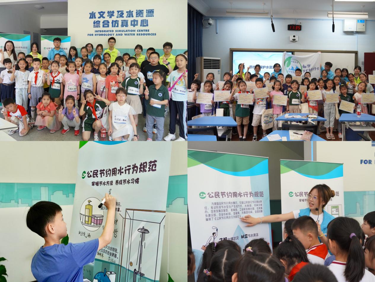 小学生们在水文学及水资源综合仿真中心老师的引导和讲解下,通过展板、实物、影片、三维动画等多种方式了解了水文学的基本知识,认识了我国源远流长的大江大河,聆听了水文人物的历史故事,对展厅中摆放的水文测验设备充满了兴趣。溯源志愿者向小学生们重点介绍了公民节水用水行为规范,并进行了节水护水知识问答互动,教会小学生们掌握节水方法,养成节水习惯。